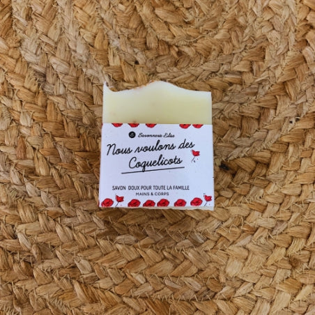 Un savon doux riche en karité à la poudre de coquelicot.